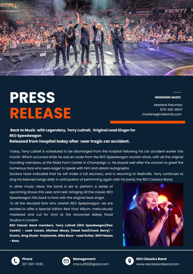 (Isstories Editorial):- Denver, Colorado Jul 2, 2025 (Issuewire.com) – Today, Terry Luttrell is scheduled to be discharged from the hospital following his car accident earlier this month. Which occurred while he was en route from the REO Speedwagon reunion show, with all the original founding members, at the State Farm Center in Champaign, IL. He stayed well after the concert to greet the numerous fans who were eager to speak with him and obtain autographs.