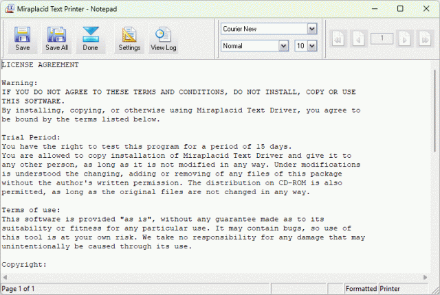 Miraplacid Text Driver supports all installed code pages as well as Unicode. It adds an icon to desktop. All the documents you drag and drop to this icon will be printed behind the scenes and processed by Miraplacid Text Driver. Turn “Auto Save Mode” on if you want Miraplacid Text Driver to handle text extraction and processing without waiting for your input. It can automatically name files and toss them to folders based on date and time, document name, as well as print job and page number.