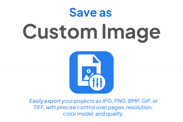 Export to Diverse Formats: Save projects as JPG, PNG, BMP, GIF, or TIFF files for web, print, or digital distribution.