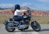 The composition draws a striking parallel between the mechanical and the natural. The motorcycle’s chrome accents catch the desert sun, mirroring the expansive sky and the shimmering teal and cream paint of the tank. The towering, ancient peaks of the Nevada range provide a majestic, monochromatic scale that makes her presence feel even more monumental. A vibrant, iridescent blue helmet rests behind her, acting as a crown of safety and style that hints at the high velocity life she leads.