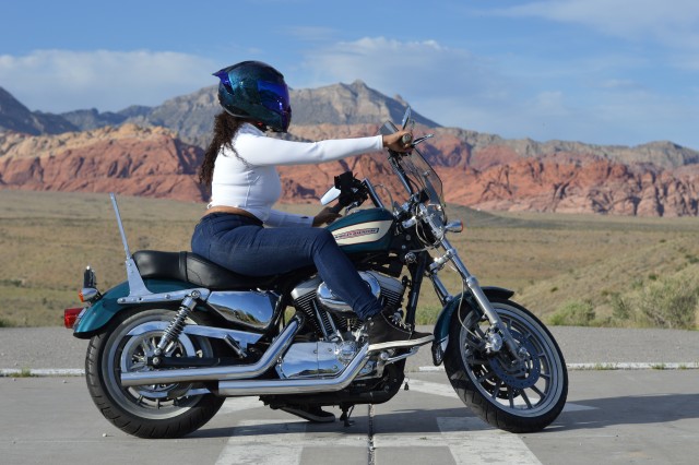 Perched with effortless authority atop her Harley Davidson Sportster, Sh’Rae embodies a spirit of unapologetic freedom. Her silhouette is a study in purposeful contrast. Clad in sleek, high waisted indigo denim and a minimalist black racerback crop, she eschews traditional biker leather for a look that is modern, tactile, and raw. One hand rests firmly on her hip while the other brushes her face in a moment of quiet introspection, highlighting the duality of her persona as both a fierce competitor and a soulful advocate.